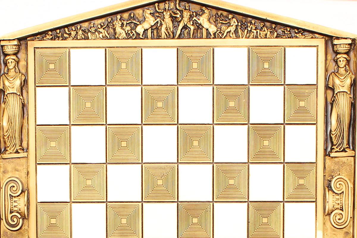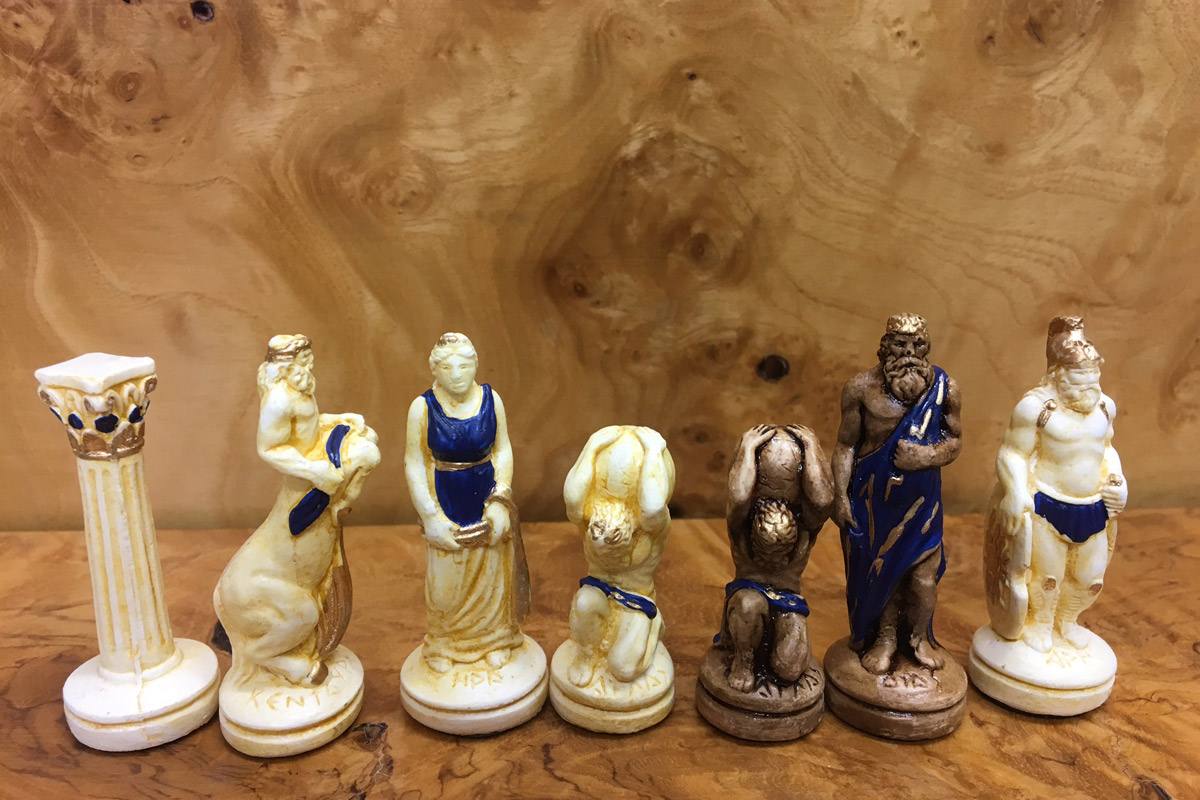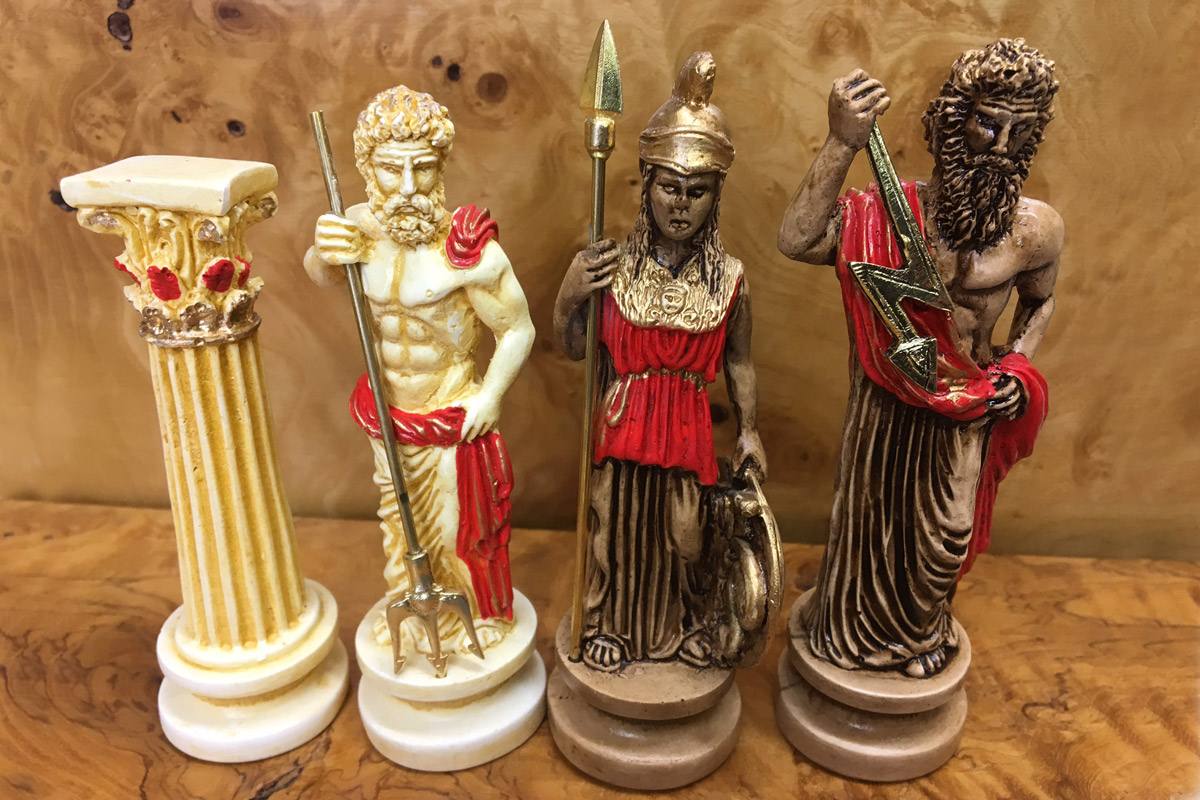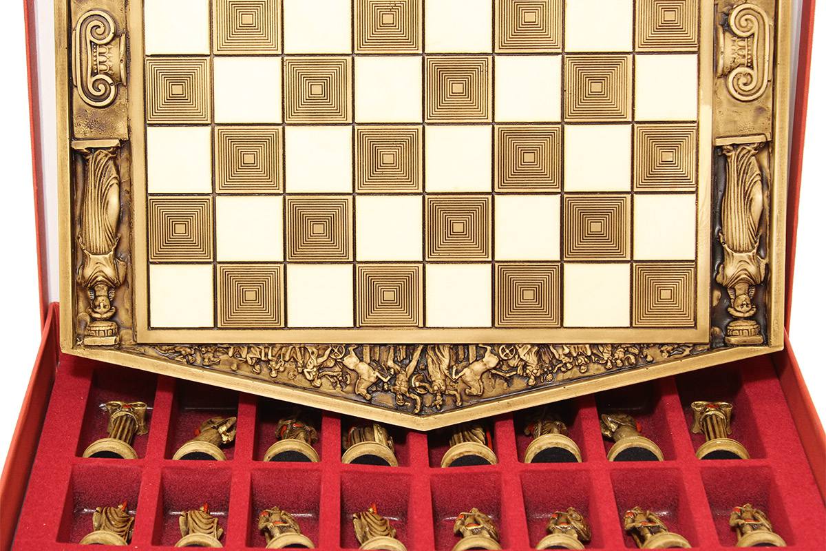 Πρόκειται για μια σκακιέρα χειροποίητη, μεταλλική με σμάλτο σε διάφορα χρώματα, και μεταλλικά πιόνια με θεματολογία τους Δώδεκα Θεούς. Η σκακιέρα είναι ενσωματωμένη στο πάνω μέρος της κασετίνας και τα πιόνια αποθηκεύονται μέσα σε βελουτέ θήκες. Επίσης παραλαμβάνεται ειδική τσάντα μεταφοράς.
