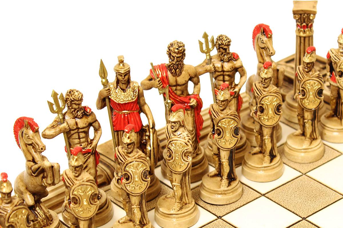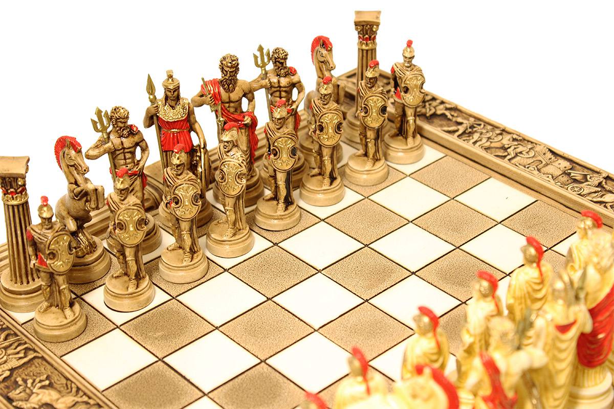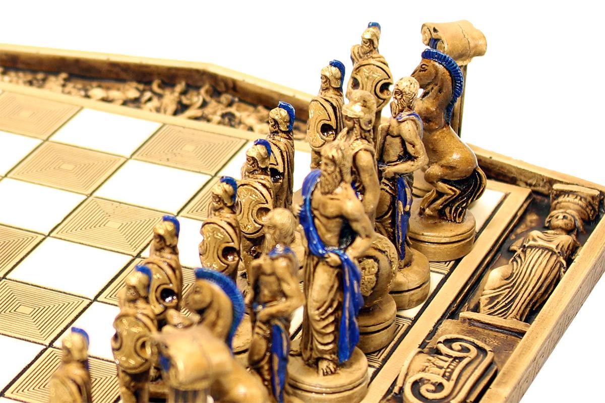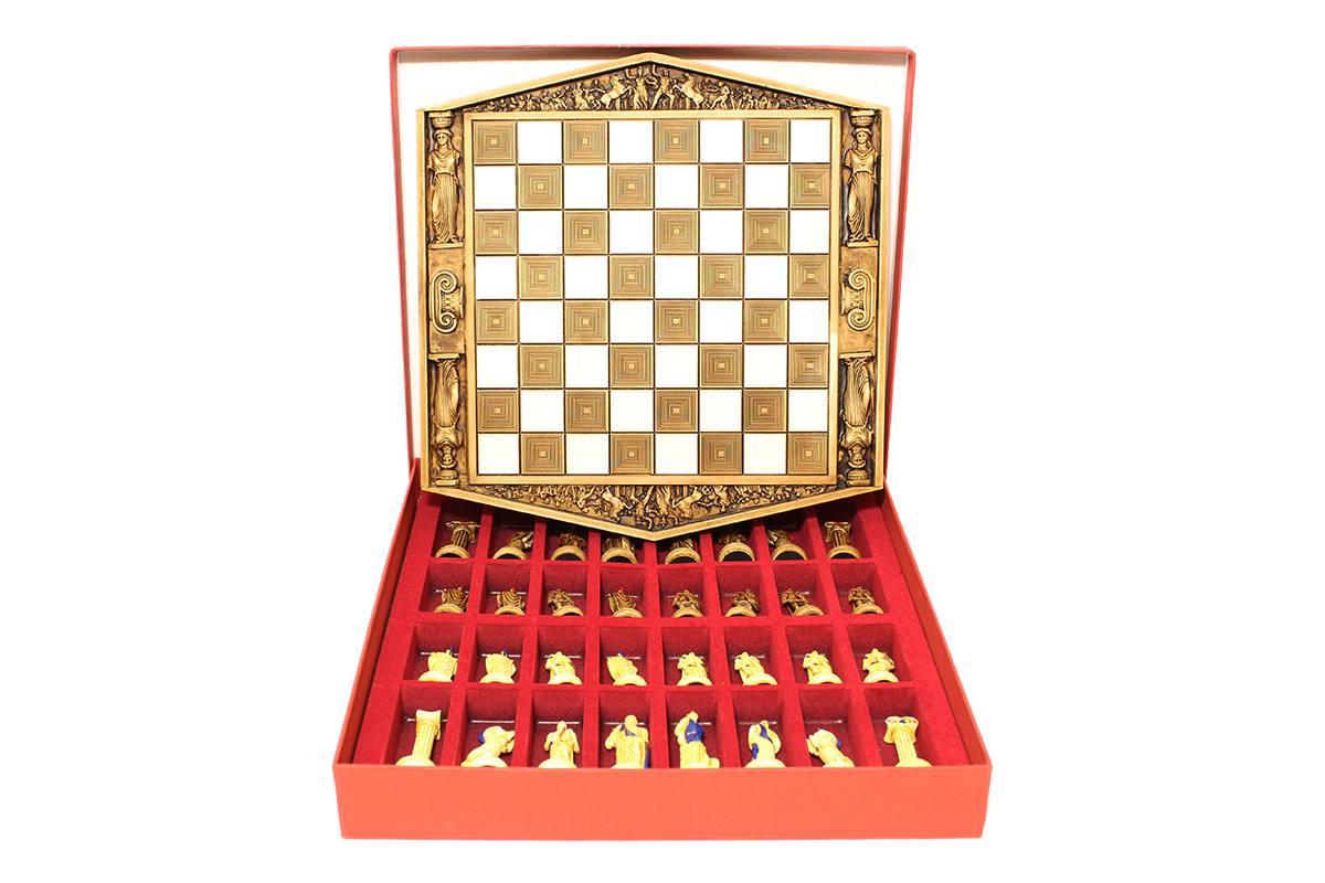 Πρόκειται για μια σκακιέρα χειροποίητη, μεταλλική με σμάλτο σε διάφορα χρώματα, και μεταλλικά πιόνια με θεματολογία τον Τρωικό Πόλεμο. Η σκακιέρα είναι ενσωματωμένη στο πάνω μέρος της κασετίνας και τα πιόνια αποθηκεύονται μέσα σε βελουτέ θήκες. Επίσης παραλαμβάνεται ειδική τσάντα μεταφοράς.