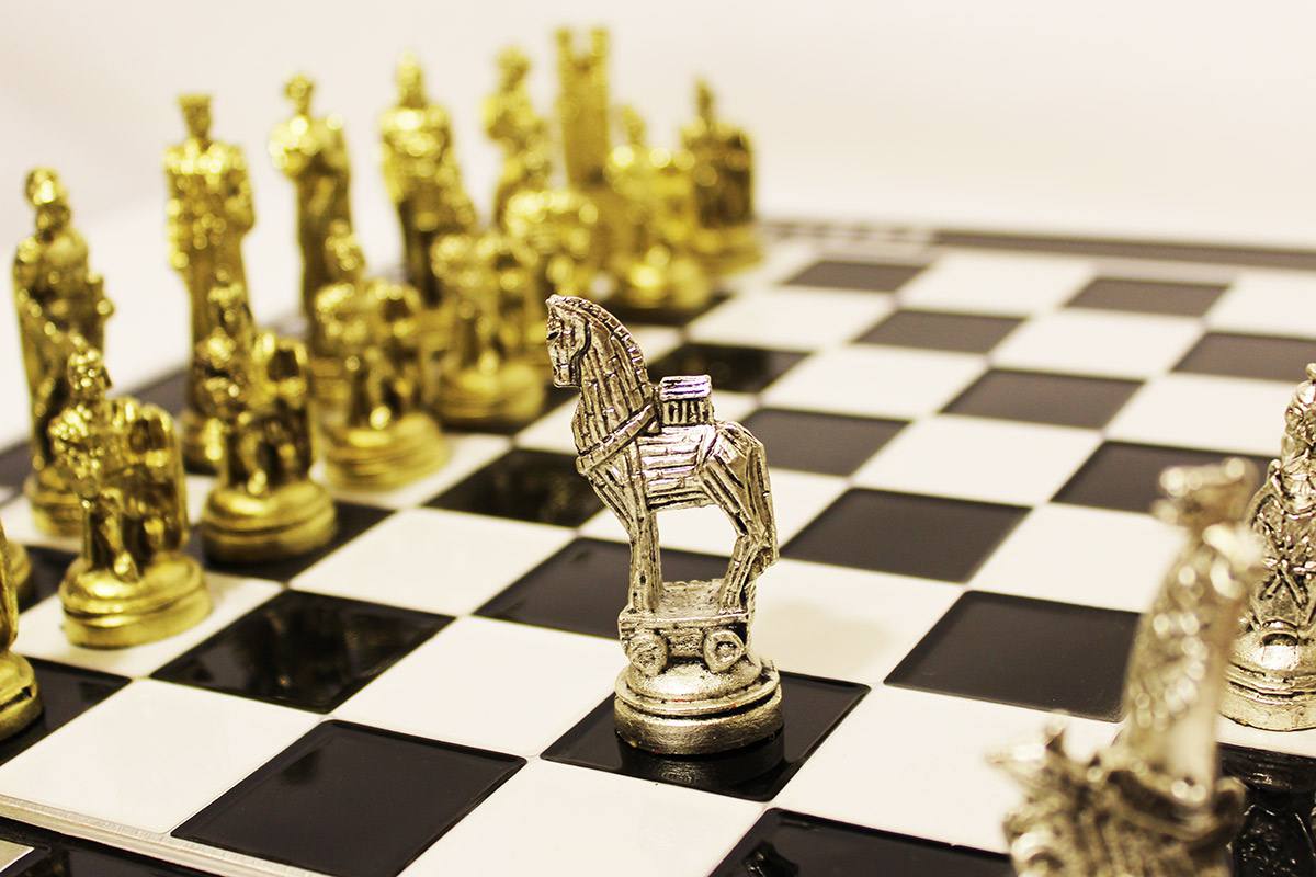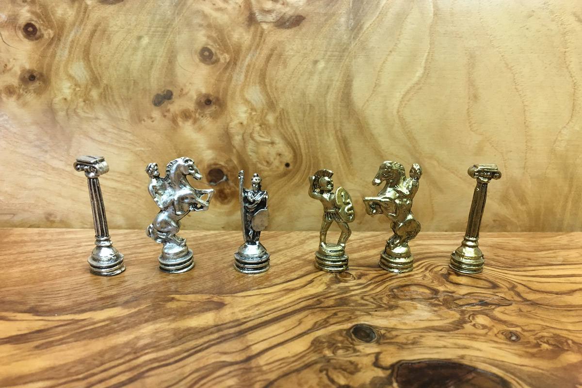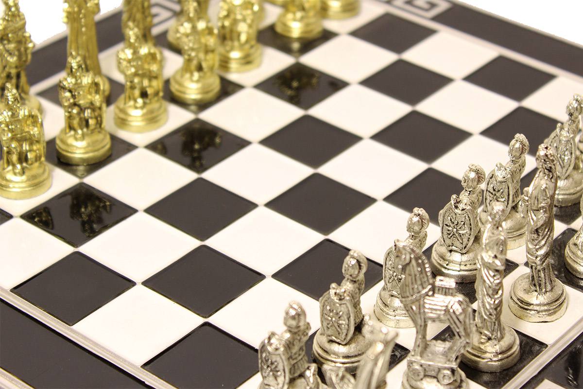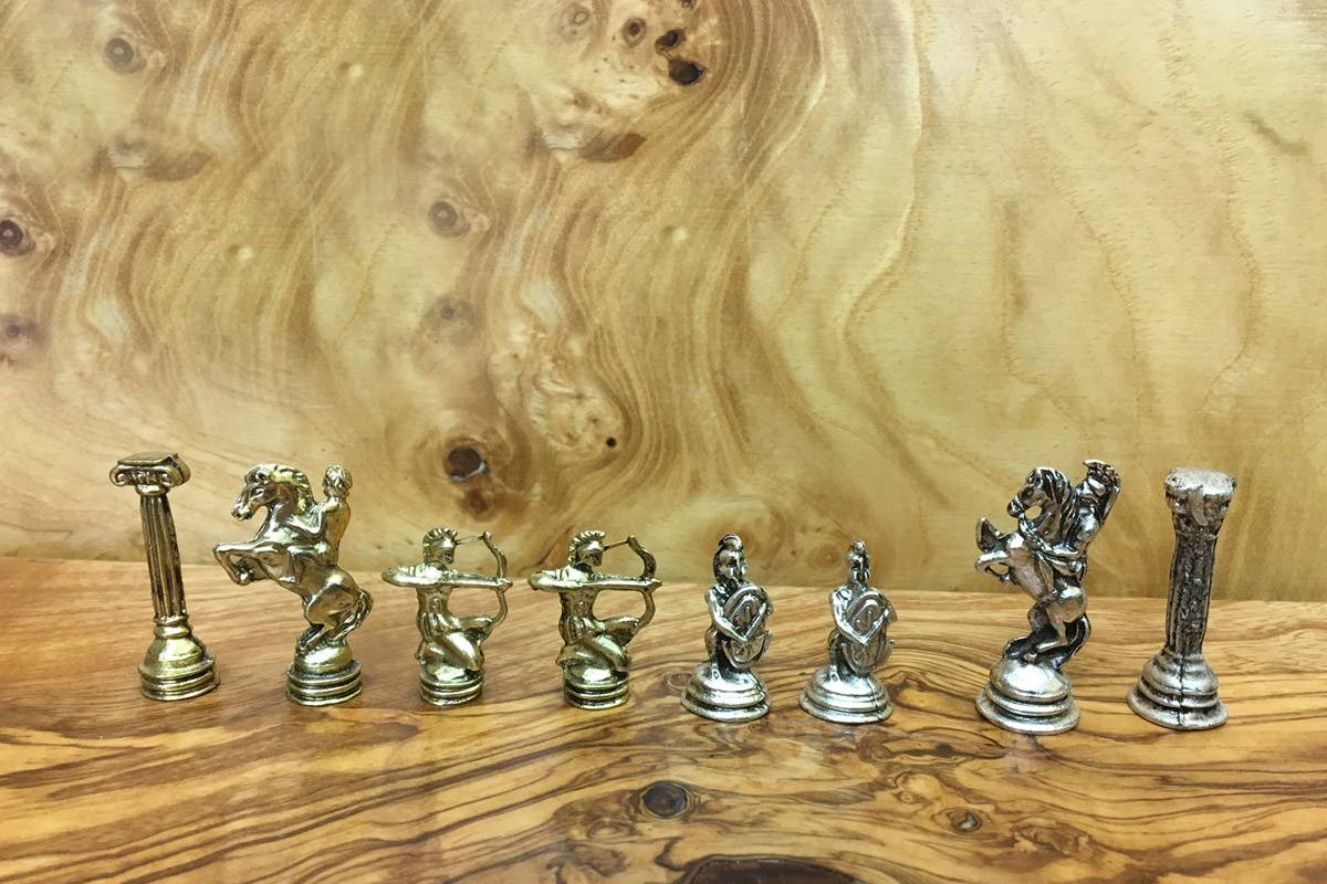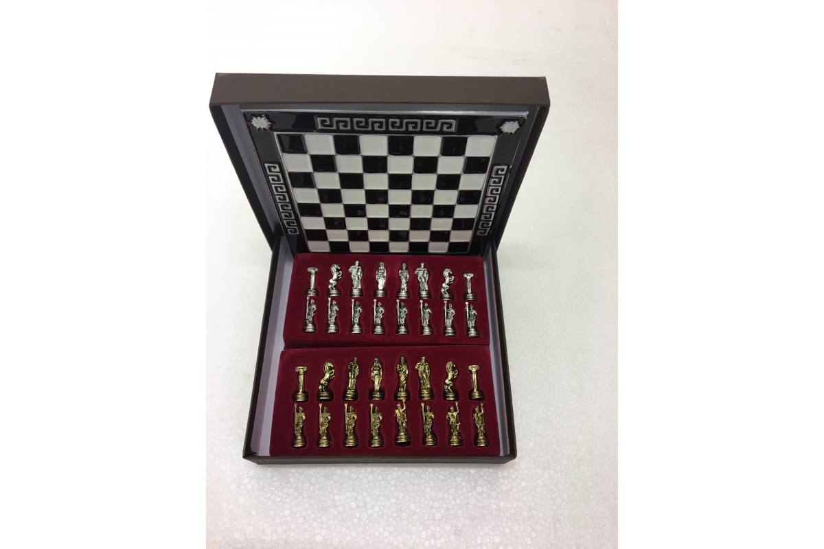 Πρόκειται για μια σκακιέρα χειροποίητη, μεταλλική με σμάλτο σε διάφορα χρώματα, και μεταλλικά πιόνια με θεματολογία τον Τρωικό Πόλεμο. Η σκακιέρα είναι ενσωματωμένη στο πάνω μέρος της κασετίνας και τα πιόνια αποθηκεύονται μέσα σε βελουτέ θήκες. Επίσης παραλαμβάνεται ειδική τσάντα μεταφοράς.