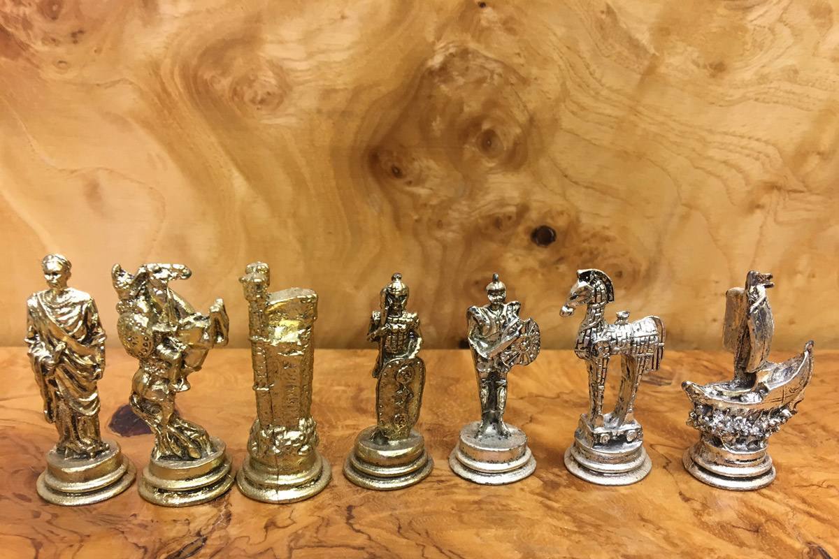 Πρόκειται για μια σκακιέρα χειροποίητη, μεταλλική με σμάλτο σε διάφορα χρώματα, και μεταλλικά πιόνια με θεματολογία τον Τρωικό Πόλεμο.