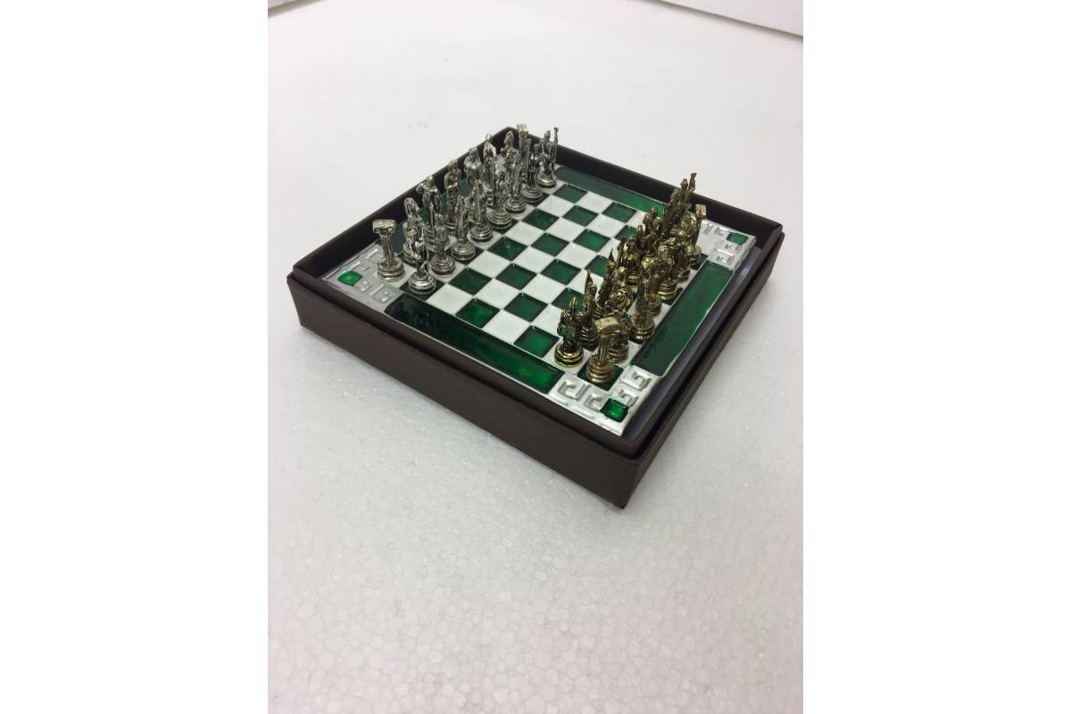 Πρόκειται για μια σκακιέρα χειροποίητη, μεταλλική με σμάλτο σε διάφορα χρώματα, και μεταλλικά πιόνια με θεματολογία τον Σπαρτιάτες vs Πέρσες.