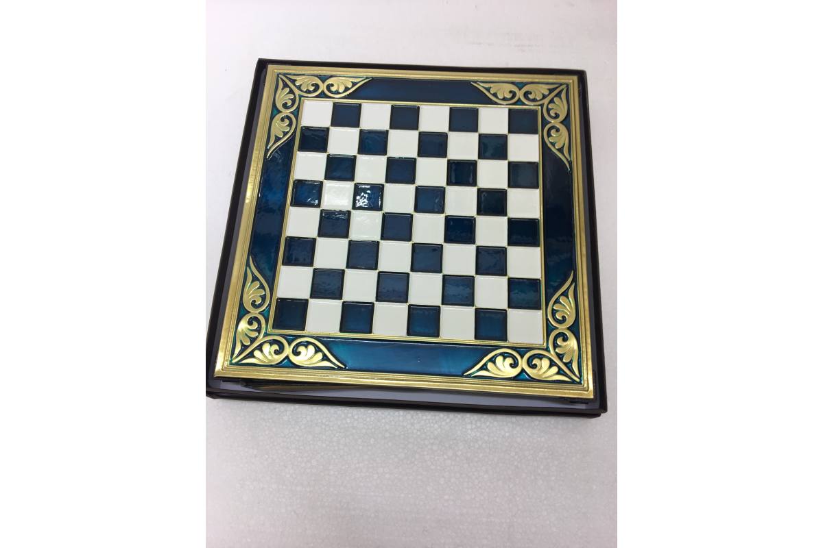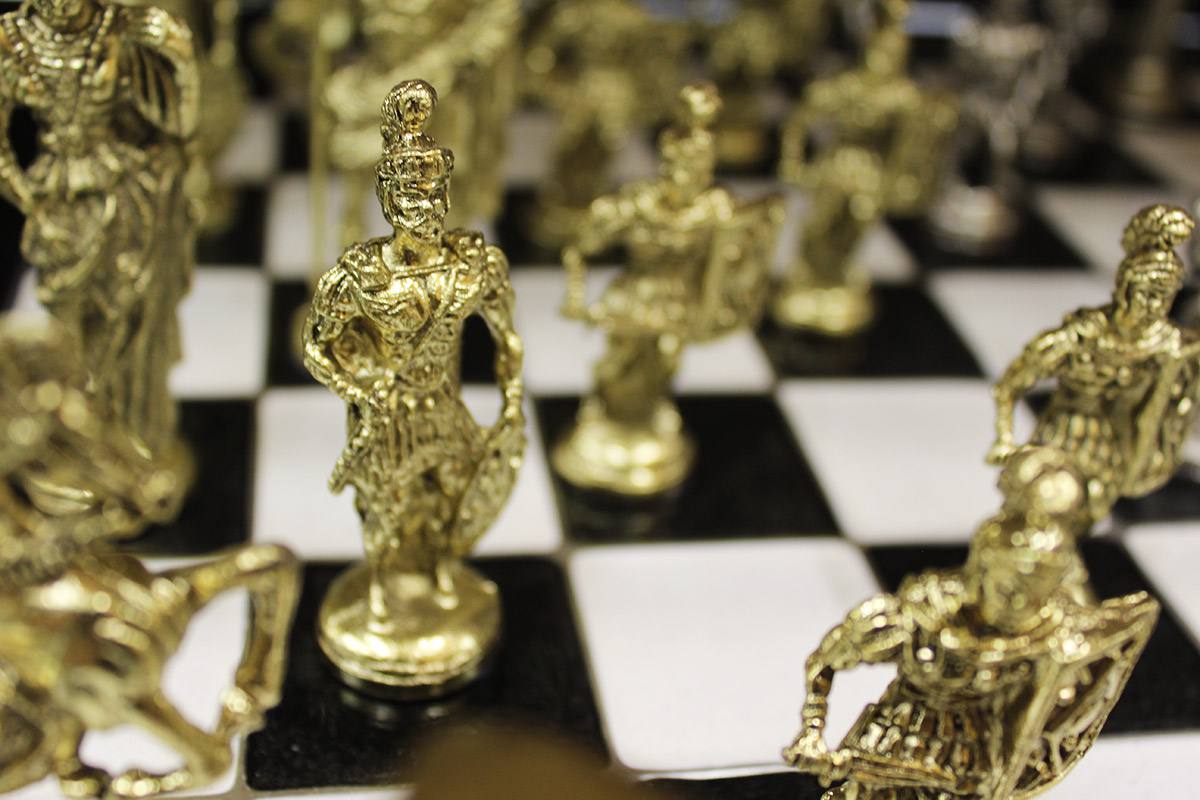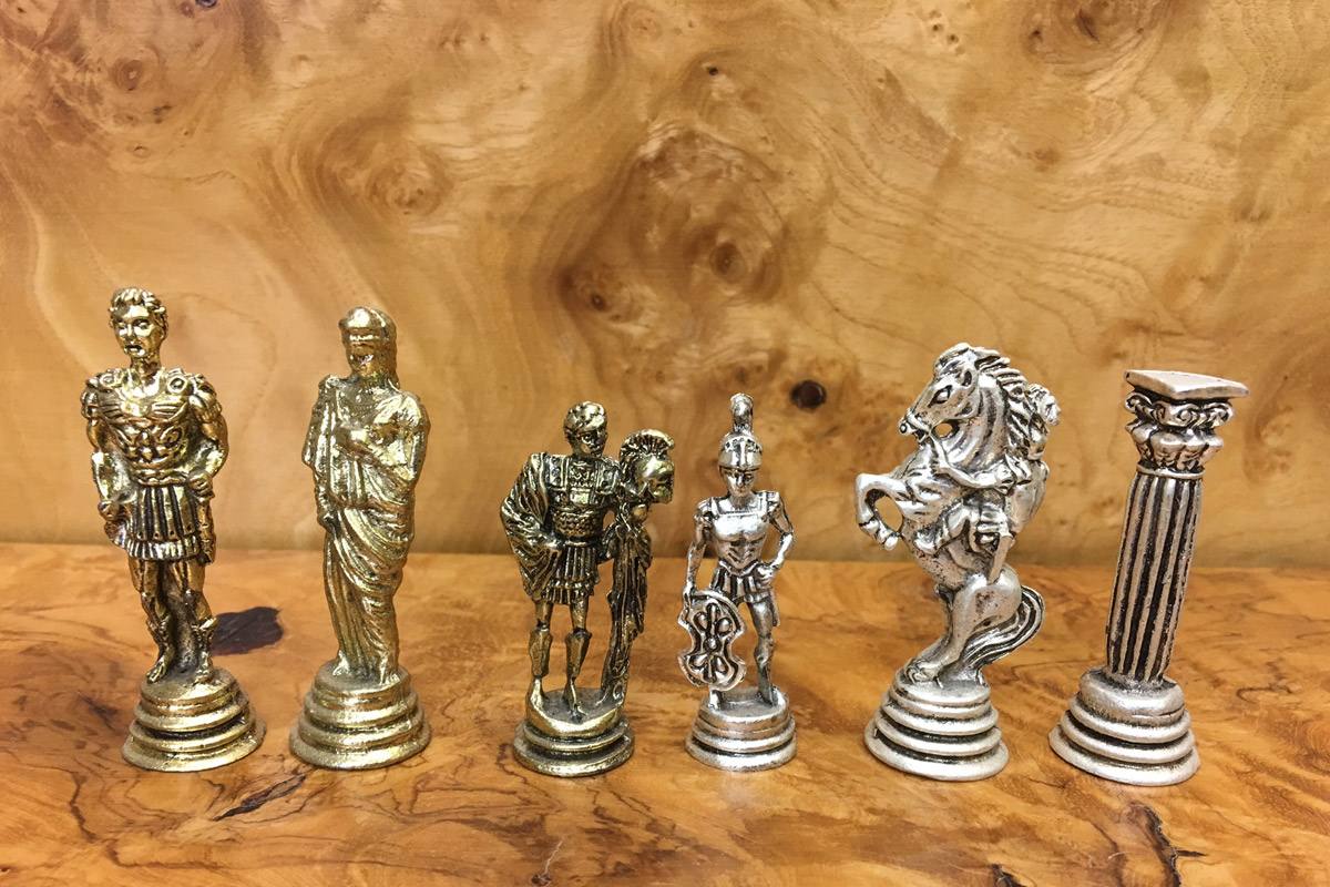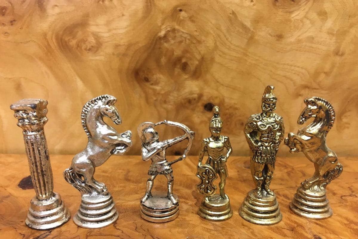Πρόκειται για μια σκακιέρα χειροποίητη, μεταλλική με σμάλτο σε διάφορα χρώματα, και μεταλλικά πιόνια με θεματολογία Ελληνορωμαϊκό.