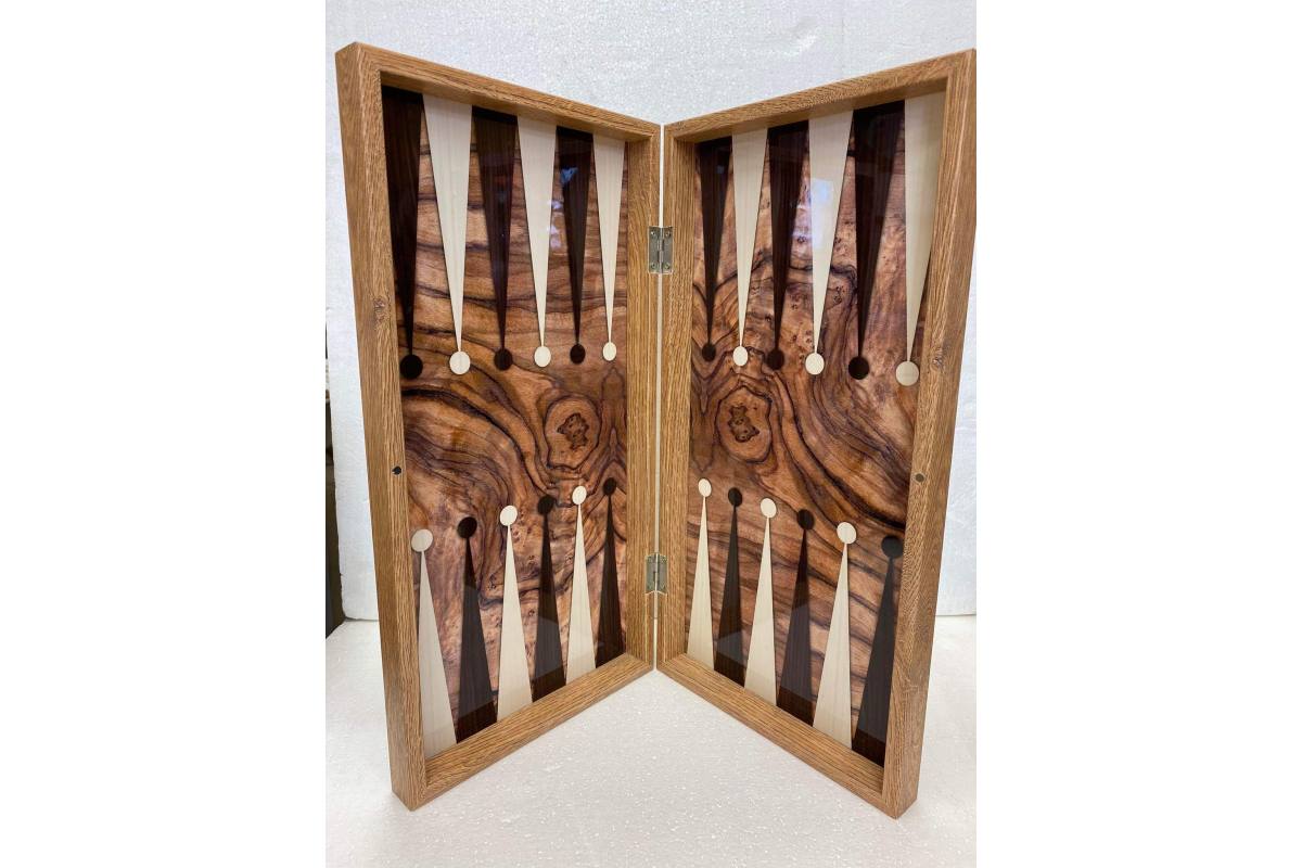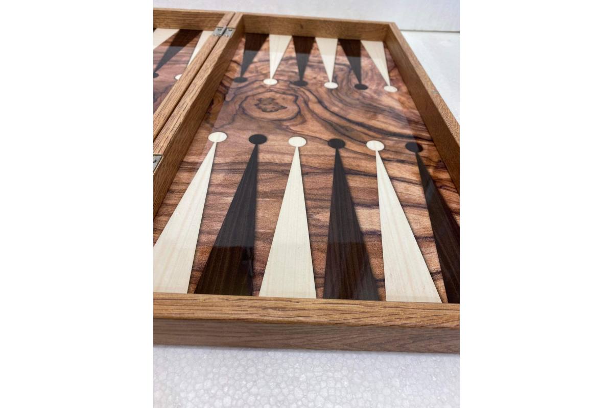 Πρόκειται για ένα τάβλι - σκάκι βαλίτσα, με θέσεις αποθήκευσεις για τα πούλια αριστερά και δεξιά. Είναι κατασκευασμένο στο χέρι από ξύλο ρίζας ελιάς, ενώ στο εσωτερικό υπάρχουν ένθετα κομμάτια ελιάς και Wenge. Το χρώμα δεν είναι στην επιφάνεια, αλλά στη μάζα του ξύλου. Το φινίρισμα γίνεται με την ένωση κομματιών φυσικού ξύλου, όπου στο τελείωμά του της...