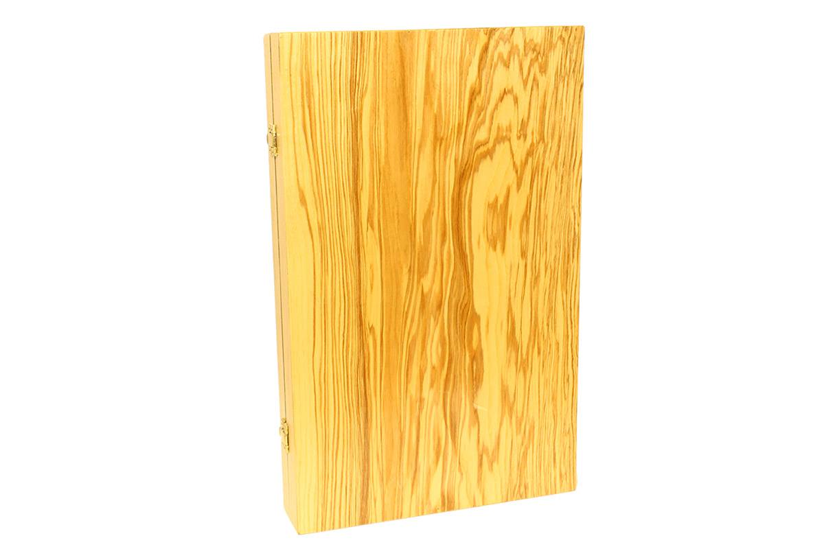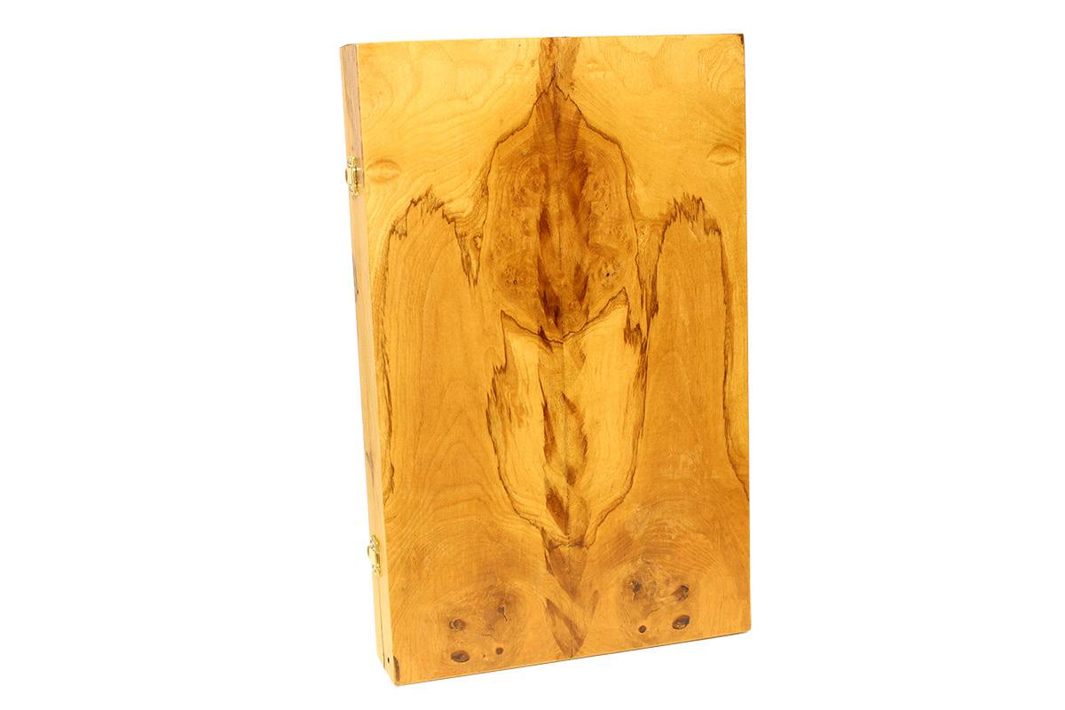 Πρόκειται για ένα τάβλι βαλίτσα, με θέσεις αποθήκευσεις για τα πούλια αριστερά και δεξιά. Είναι κατασκευασμένο στο χέρι, από ένθετα κομμάτια κορμού ελιάς και Wenge. Το χρώμα δεν είναι στην επιφάνεια, αλλά στη μάζα του ξύλου. Το φινίρισμα γίνεται με την ένωση κομματιών φυσικού ξύλου, όπου στο τελείωμά του της διαδικασίας, εφαρμόζεται βερνίκι φούρνου, για...