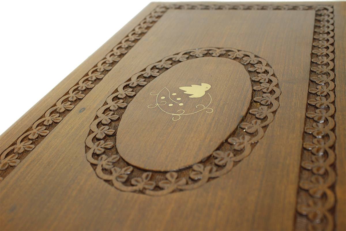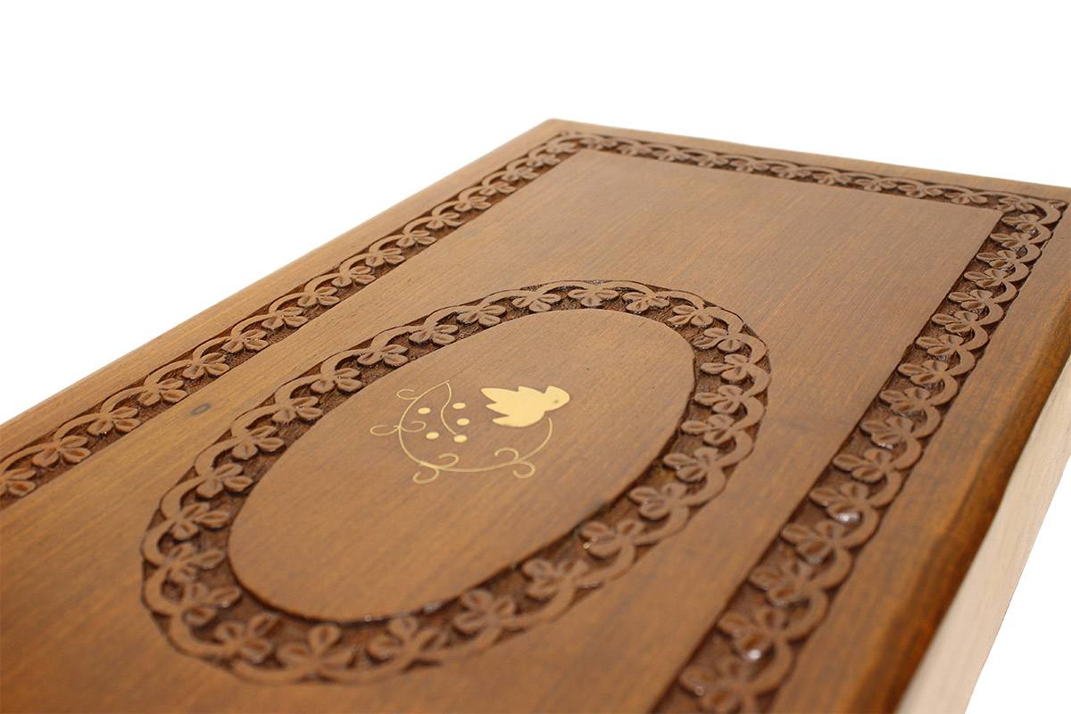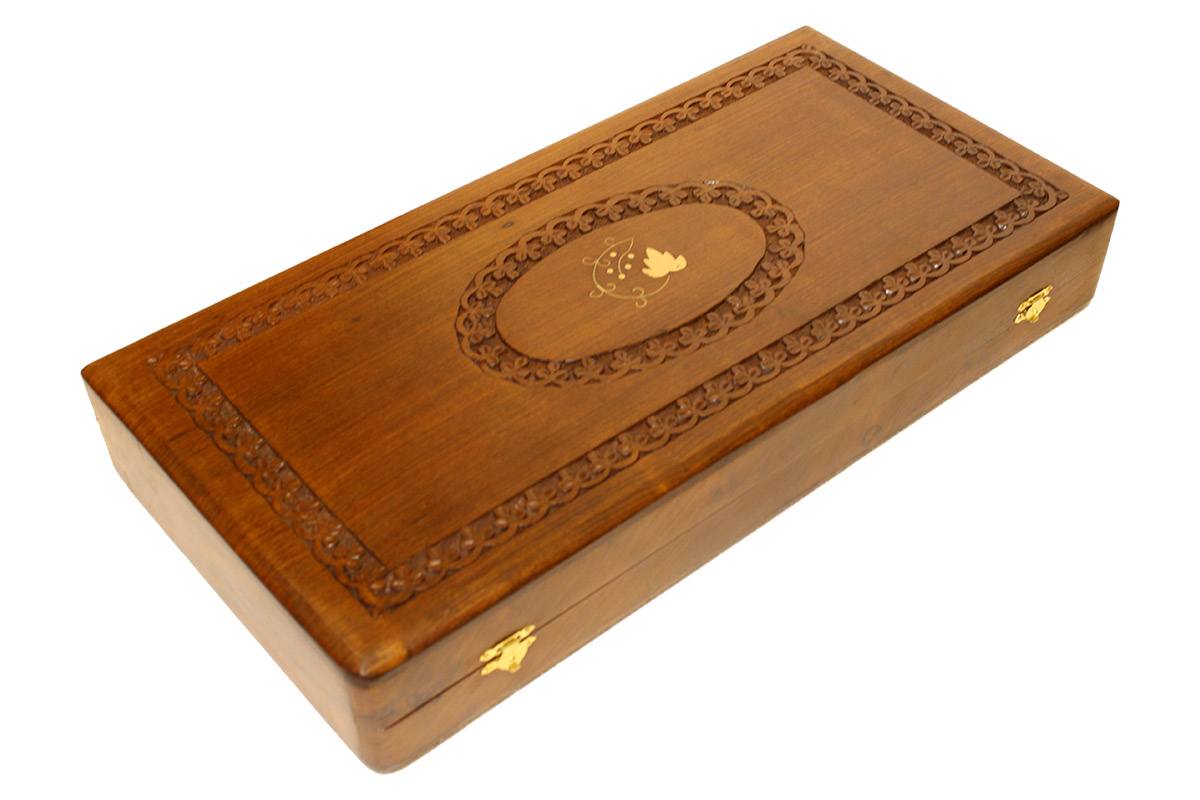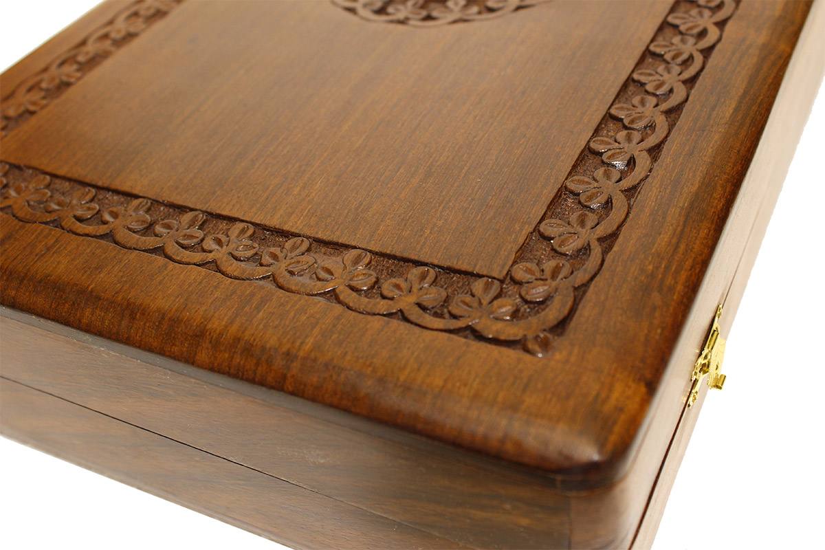 Το συγκεκριμένο τάβλι είναι σκαλιστό, μασίφ (4kg) χειροποίητο από κορμό καρυδιάς με εντυπωσιακό σκάλισμα (3mm βάθος) στην εξωτερική του επιφάνεια καθώς και εκπληκτική τοποθέτηση από ένθετα φιλέτα μπρούτζου μέσα στο ξύλο.